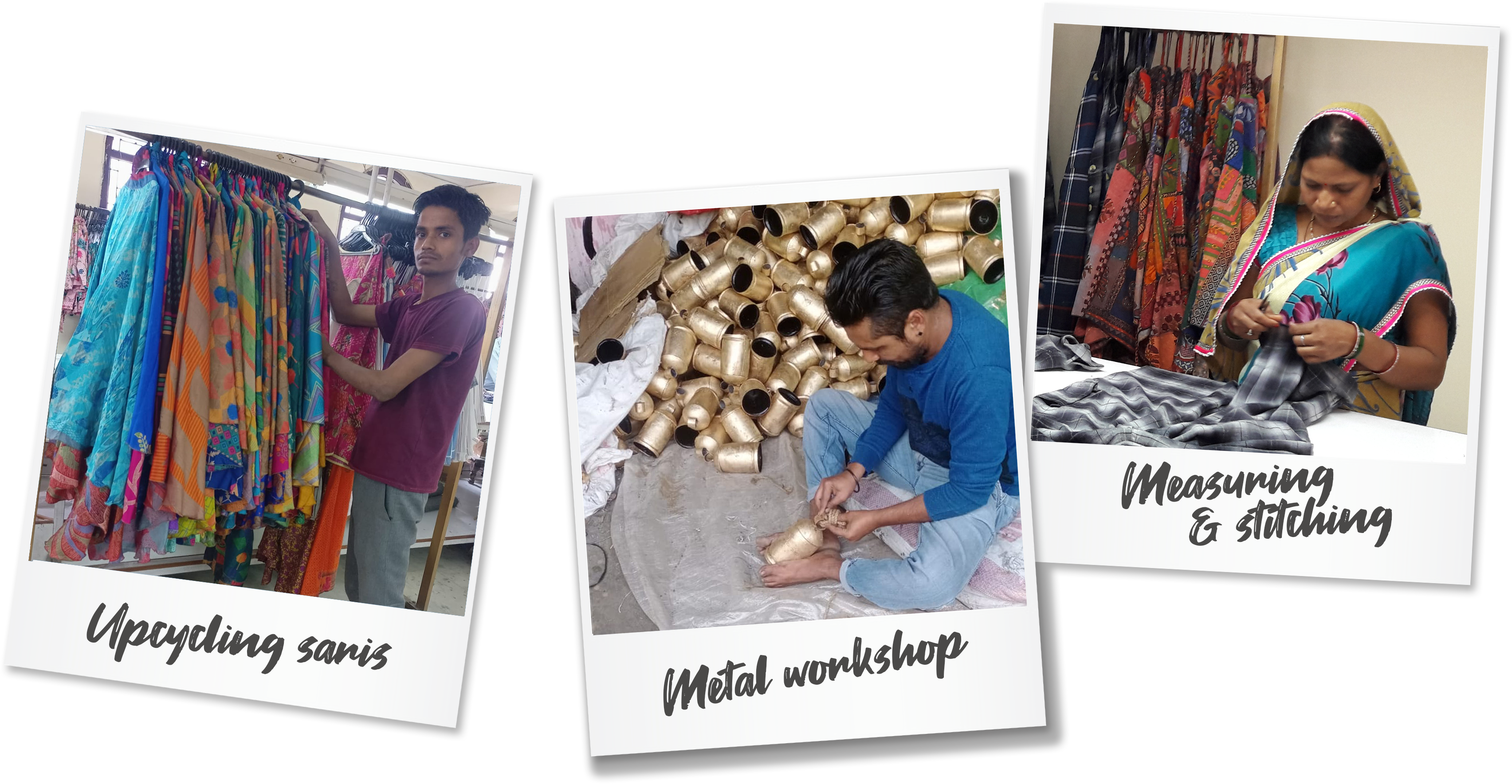 Our Indian clothing range incorporates many traditional styles and materials such as kantha and sari. Many of our products made from these fabrics were previously traditional sarees and have been recycled and repurposed into new clothing and accessories.