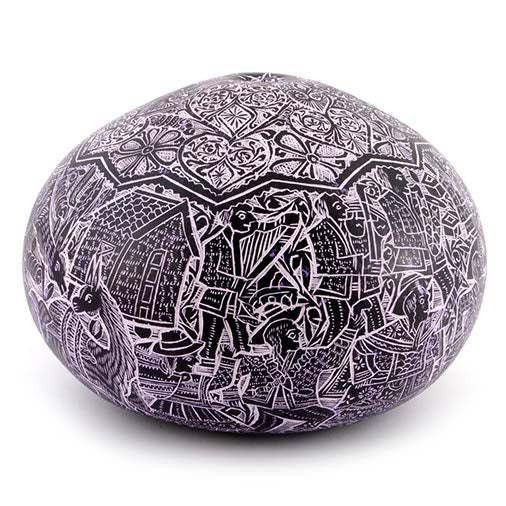 These absolutely stunning works of folk art are hand produced in Peru by a small specialist workshop. These black and white styles feature highly detailed etchings and very intricate scenes of life in Peru. Around the outside there are festival scenes with a marching band and dancing locals in traditional dress as well as a herd of iconic llamas! The top of the gourd is decorated with a complex and beautiful pattern of spirals and interweaving shapes. These beautiful and unique pieces are fantastic works of art and extremely detailed examples such as these are much sought after by collectors. For more information and pictures of our gourds being made, please visit our blog here.