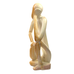 This giant soapstone statue has been hand carved by skilled artisans and depicts a man deep in thought. It is a more abstract sculpture and stands at a grand 36" tall, making it a dominating feature piece. The natural colouring and textures of the stone have been left to make this even more of a unique piece or artwork. Most of the worlds soapstone originates from Kisii in the western highlands of Kenya and so is home to the best soapstone artisans and carvers. The talc in soapstone is soft to touch, hence the name. Before starting work the stone must be immersed in water to make it even softer and therefore easier to work with. Using a hammer and chisel the main shape is carved out. This item is cash and carry only. Approx. 36" height × 18. 5" width × 11" depth
