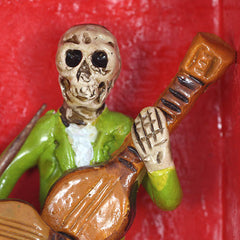 Celebrate love’s grandeur with this hand-painted retablo featuring a joyful wedding scene: skeletal bride and groom united under a canopy of vivid floral arches, surrounded by their guests and musicians. This enchanting piece exudes mystical charm—perfect as a standout wedding gift or piece of quirky wedding decor, or great as a spirited accent during the Halloween season.