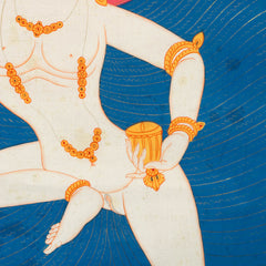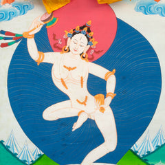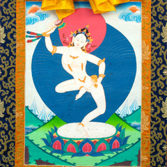 Machig Labdron is commonly viewed as a dakini, a yogini and as a deity. She was unusual in that she was both a woman and a Tibetan, distinguishing her from the normal path of Indian male Buddhist masters. Machig Labdron spent her life in various guises, a brilliant scholar, respected teacher, caring mother and wandering mendicant. She is depicted here holding a damaru double-headed drum in her right hand and a ghanta bell in her left, her leg raised in a dancing pose atop a lotus pedestal. Also of note is her three eyes and beatific countenance. This large thangka has been carefully hand painted in the traditional style by skilled artisans in the Kathmandu Valley. It is then bordered with luxurious brocade material. Every thangka is traditionally given a veil which is used to cover the painting when not in use for protection. Inc brocade approx.: 97cm × 56cmPainting approx.: 52cm × 37cm