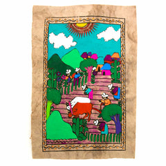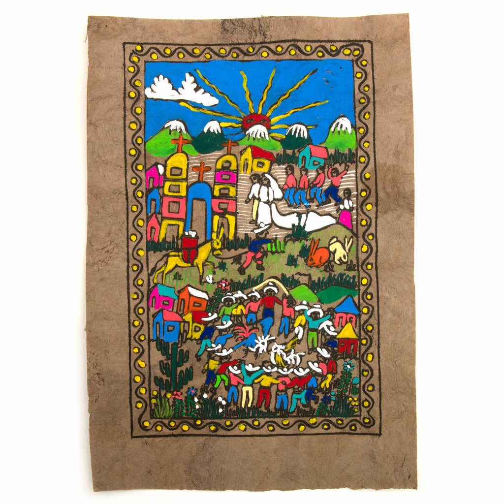 These beautiful paintings will bring a small piece of Mexican culture to your home! Each piece has been intricately painted by hand on paper made from natural bark pulp paper. The bright colours depict a variety of traditional Mexican scenes. As each painting is created by an individual skilled artisan, no two items are quite the same - truly unique artwork! Approx 20. 5cm × 29cm - roughly A4Assorted designs.