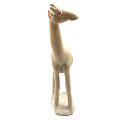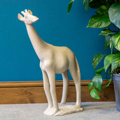 Standing at22" high, this gorgeous giraffe sculpture has been hand carved by incredibly talented Kenyan artists. The natural colouring and textures of the soapstone have been kept to show off the beauty of this stone. Most of the worlds soapstone originates from Kisii in the western highlands of Kenya and so is home to the best soapstone artisans and carvers. The talc in soapstone is soft to touch, hence the name. Before starting work the stone must be immersed in water to make it even softer and therefore easier to work with. Using a hammer and chisel the main shape is carved out. This item is cash and carry only. Approx. 57cm height × 15cm width × 30cm length