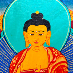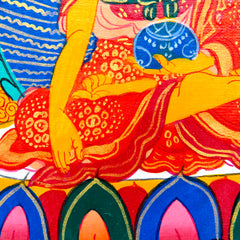 Handmade from wood and painted in bold hues, this frame is designed to hold a sacred thangka painting. The painted border features floral and symbolic motifs and draws the eye towards the artwork at its centre. It is a perfect way to display your favourite thangka or artwork while adding colour to your wall.