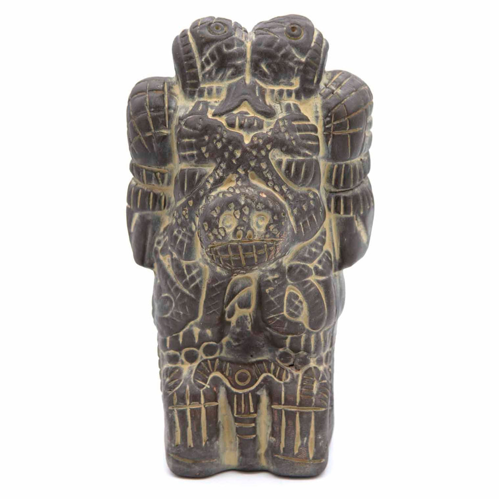 Coatlicue is the Aztec goddess of childbirth and fertility. She was also the goddess of earth, both as it's creator and destroyer. The dualism is symbolised by her appearance: her face consists of two serpents and her fingers and toes are claws. She wear a skirt of intertwined snakes and a necklace of hands, hearts and a skull from where she feeds on everything that dies.
