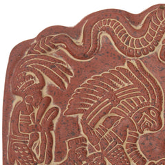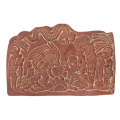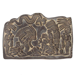 These fascinating plaques depict a Mayan scene of ritual human sacrifice. In pre-Columbian Mayan culture, human sacrifice was used in order to please their gods. Evidence for the prevalence of human sacrifices in Mayan culture has been found in numerous rock art sites and engravings of which this plaque is based upon. These plaques make great teaching tools to help in understanding the culture of the ancient Maya. Mixed colours