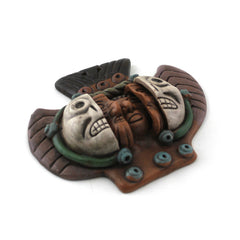 This mask, similar to ones found in pre Aztec ruins (Teotihuacan) and in Mayan ruins ( Tikal, 900AD ) shows how ancient Mesoamerican cultures viewed the differing stages of life as part of a cycle of human existence through life and then onto the afterlife. There are three layered faces, the inner one being birth was originally painted red to show freshness and health, the middle layer representing adulthood which was yellow for maturity, and the outer face which symbolised the end of earthly life which was white for death. They believed that as death arrived so a new cycle began, and many preparations involving rituals and gifts were made to prepare the soul for the afterlife. These masks depict a major Aztec preoccupation: the passage of time. Each layer shows a stage of a human's life: youth, adulthood and old age and death. The masks were traditionally worn during ceremonial events or placed upon graves. Approx 17cm × 14cm
