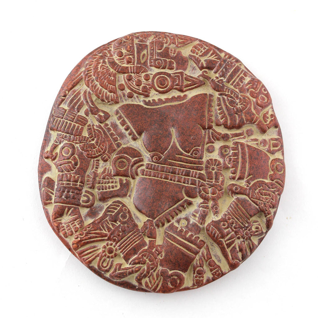 These small plaques depict Coyolxauhqui, a moon goddess. In this plaque she is shown lying on her side with her head, arms and legs chopped off from her body. She was killed in such a way because she attempted to launch an attack on her own mother. Various colours available