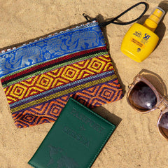 These eye catching, medium sized bags are made from our wonderful Thai weave style cotton. Each bag is hand made in Thailand and is decorated with a length of golden thread elephant trim fabric. The zip up top and handy size makes these bags a useful travelling accessory! Colours & Patterns vary