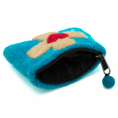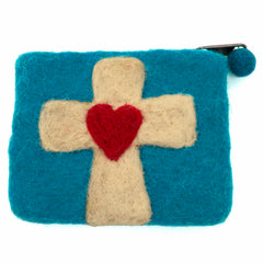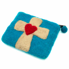 A fully lined purse with a colourful felted cross design with decorative heart. It has a zipped fastening with extra felt bobble, and is a handy size for carrying your cards and cash around.