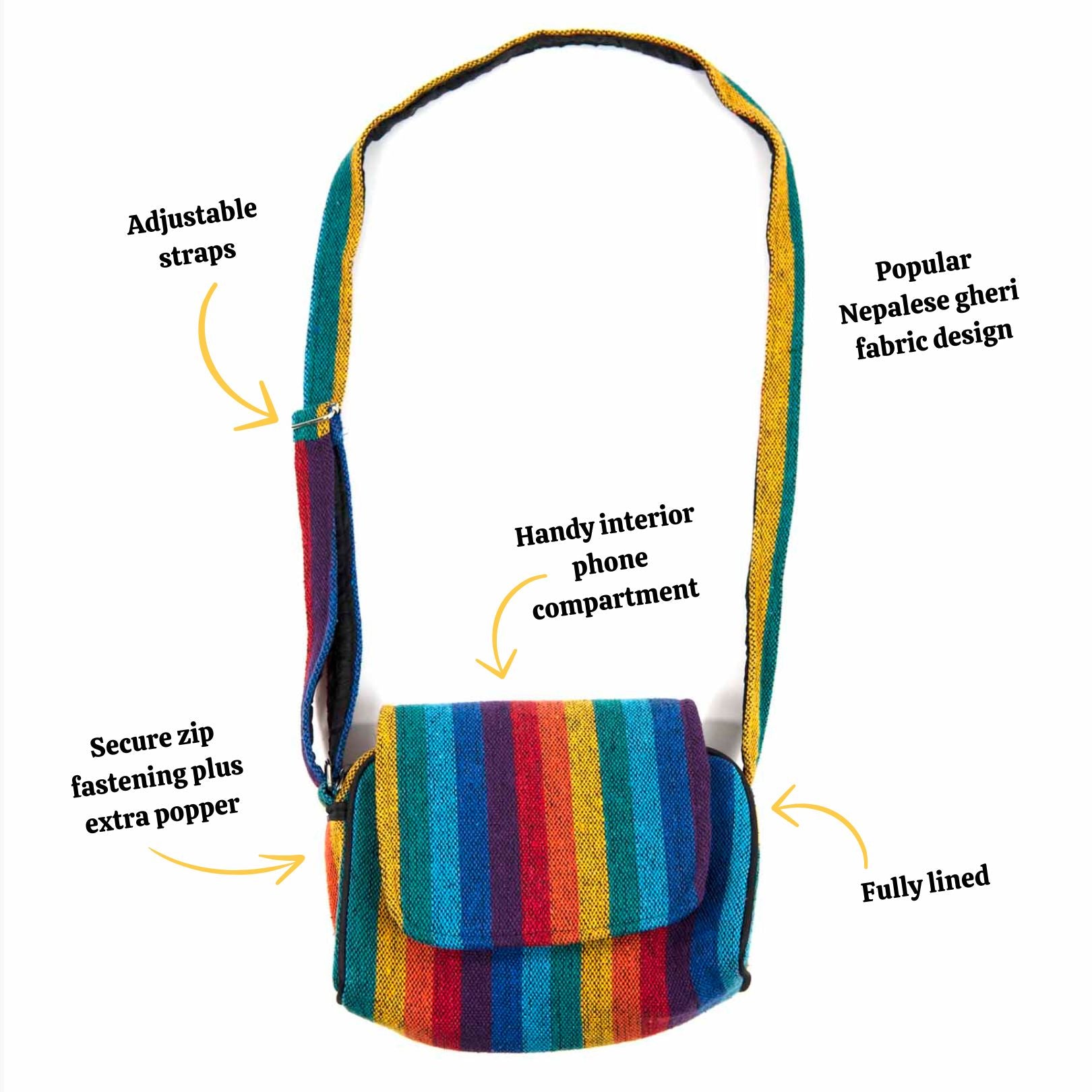 This stylish bag is a compact size for popping out and about. The vibrant rainbow gheri fabric adds a hippie vibe to the satchel-like style. An adjustable shoulder strap allows you to wear it at the desired length, and it has an inner compartment for keeping your phone handy. The main bag itself has both a secure zip fastening and an extra popper.