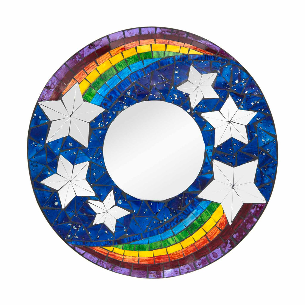 This decorative round mirror is adorned with colourful mosaics creating a wonderful design of rainbow shooting stars flying through the night sky. The central area is a full mirror and there is a handy hanging hook on the back for easy display.