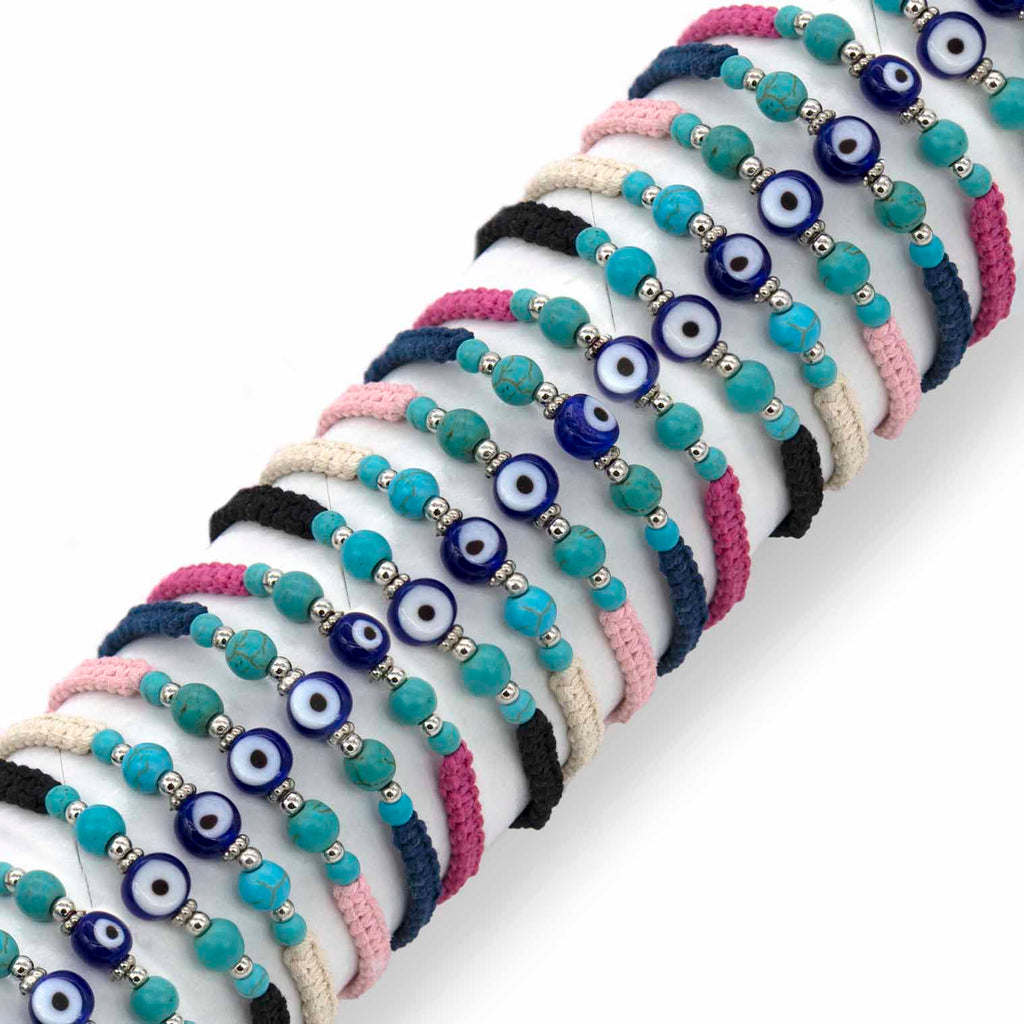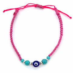 A colourful tube of woven waxed cord wristbands. Each has a resin evil eye which is complemented with silver and turquoise coloured beads. Each has a slip knot so it is fully adjustable and easy to remove.