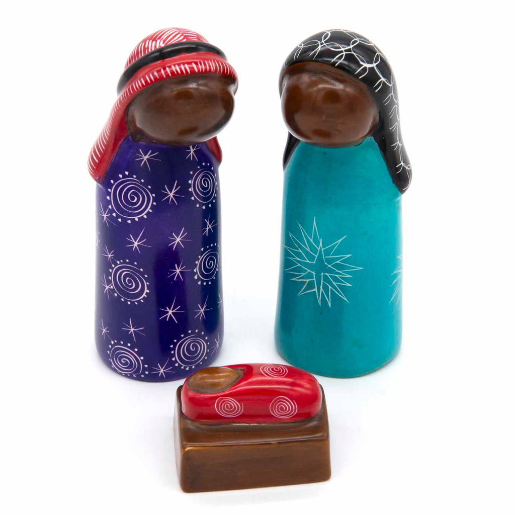 Bring a splash of colour and serene simplicity to your festive décor with this Soapstone Nativity Set. Each figure—Mary, Joseph, and baby Jesus—is carved in a minimalist style from tactile soapstone, capturing the essence of the nativity in clean, simple forms. This set adds a contemporary yet timeless touch to your home and can also be displayed on your Christmas tree for a festive accent.