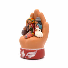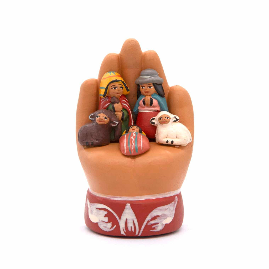 Hand-sculpted and hand-painted from ceramic, this nativity showcases the traditional craftsmanship of Peruvian artisans. The design carries spiritual symbolism, with the hand representing protection and blessing, while the careful painting and sculpting reflect the enduring folk art traditions of the region.