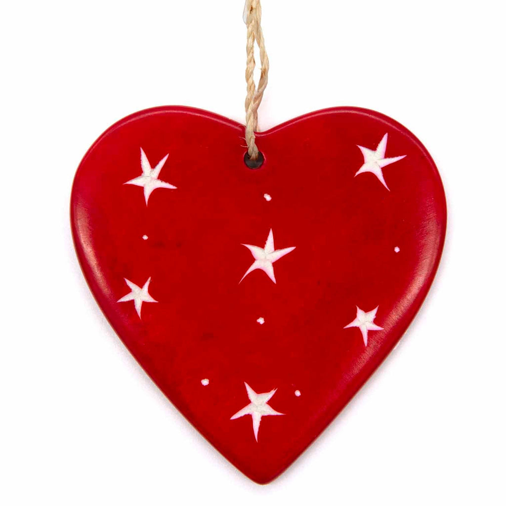 This handcrafted soapstone heart brings a touch of warmth and charm to any space, whether hanging from a shelf or mantel. Dyed in a rich, rosy red and engraved with delicate star patterns, it adds a splash of colour and a hint of mystical elegance all year round—and it also makes a delightful Christmas tree decoration during the festive season.