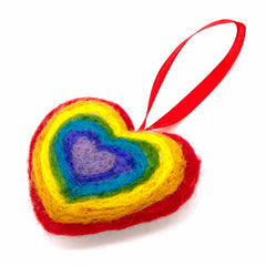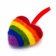 Show some rainbow love with this cheerful Pride Heart Felt Hanging! Handmade from soft wool felt in Nepal, each heart is stitched in vibrant rainbow stripes and finished with a red hanging loop, ready to brighten any corner of your home. Perfect as a year-round decoration, it also makes a joyful alternative addition to your Christmas tree.