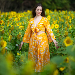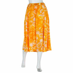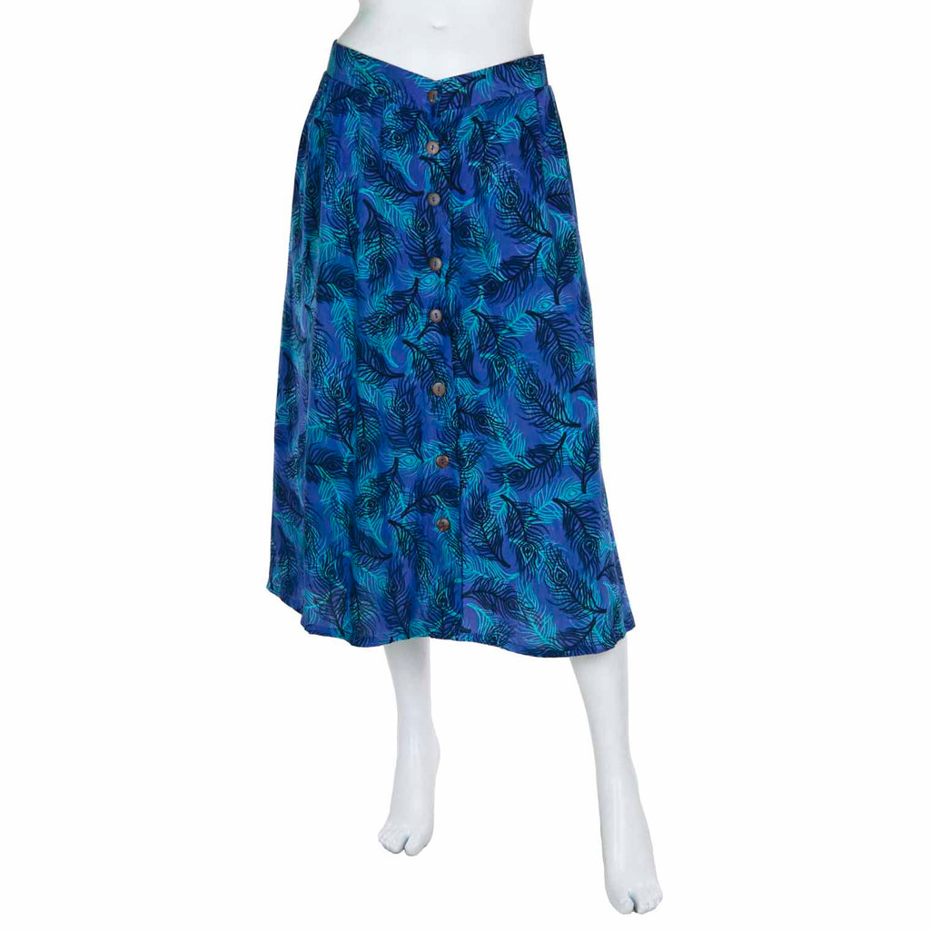 Our very own Siesta exclusive design decorates this calf length skirt, and delicate coconut buttons run the entire length of the front. The waistband is elasticated at the back and it is lightweight making it super comfortable.