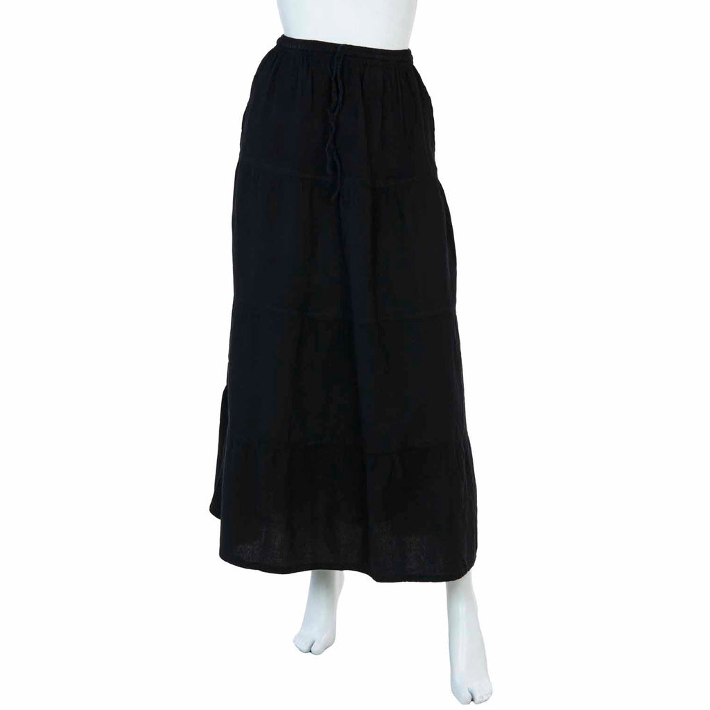 Simple yet elegant long cotton skirt with elasticated and drawstring waist with side pockets. Available in three colours. Looks great teamed up with a patterned top and is cool in the summer heat but can also be worn with boots in the winter.