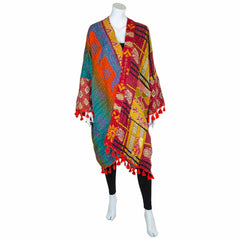 Introducing our stunning Kantha shrugs, versatile garments that can also be worn as open jackets. Featuring a decorative tassel trim and a large side pocket, these beautiful pieces are a celebration of tradition, sustainability, and the art of recycling. Kantha is one of the oldest and most cherished forms of embroidery, originating from the heart of India. Women from all rural classes practice this time-honoured craft, infusing each piece with their skill and passion. The name "Kantha" refers to both the unique style of running stitch and the finished work of art. Our Kantha items are not just beautiful garments; they are a testament to sustainability and creativity. They are crafted from recycled cotton saris, which gives each piece a character of its own. You may see some small patches incorporated into the flow of the garment, these should not be considered flaws but rather a distinctive feature of the fabric. They represent the part of the journey that this fabric has already completed, a connection to the past and a renewal of its purpose. All Kantha textiles will predominantly feature vibrant shades of oranges and yellows, owing to their unique origin from recycled cotton saris. These warm and cheerful hues are a reflection of the traditional attire favoured by Indian women, making them an integral part of Kantha designs. One size