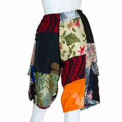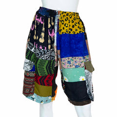 These colourful combat shorts are perfect for summer as they are lightweight and loose fitting. Created from various off cuts that, rather than being thrown away, have been collected and stitched together. Since the off cuts are always changing, so too does the fabulous fabric causing each item to be unique.