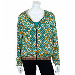 This super fun lightweight jacket is two in one - turn it inside out for a completely different look! With a handy hood and each side having two handy pockets it is a great style and addition to your summer wardrobe. Due to being made from recycled saris and having two sides, each jacket is completely unique!