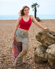 These beautiful wrap trousers are crafted from lightweight rayon, giving them a lovely flow and drape that enhances the design. Ideal for summer holidays when paired with sandals, they also look fantastic with tights and a chunky pair of DMs as the weather turns cooler.