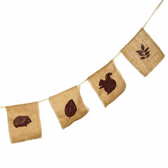 This tactile bunting made from hessian has been printed with wildlife illustrations, including owls, squirrels, deer, hedgehogs and leaves. It is perfect to decorate your outside space and campsite! Each flag: 16cm × 14cmBunting length approx: 260cm