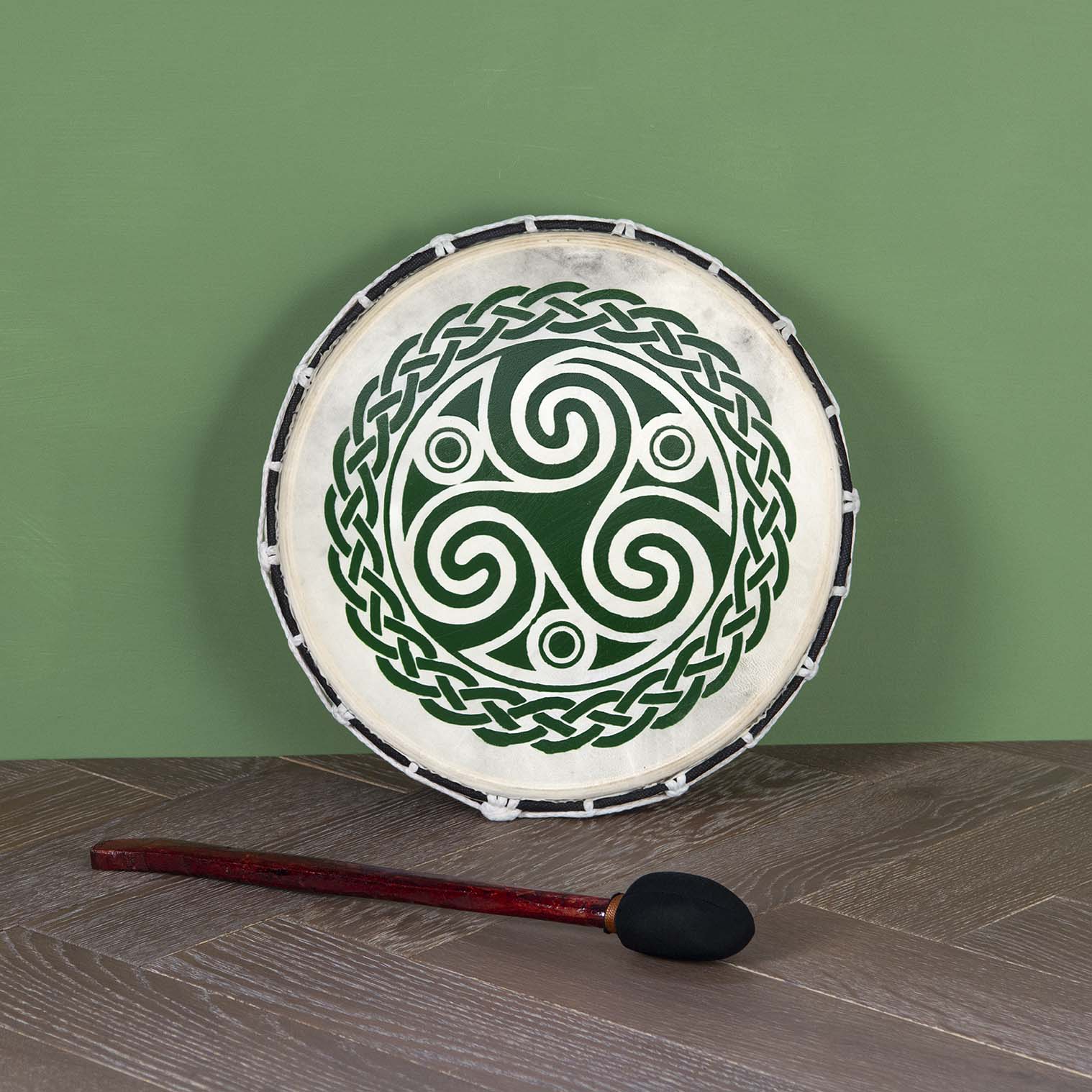 Shamanic drums have served as sacred instruments across cultures for thousands of years, used to facilitate healing, spiritual connection, and altered states of consciousness. The rhythmic beat mirrors the human heartbeat, helping practitioners enter trance states and access deeper levels of awareness. This drum features a natural hide drumhead stretched over a wooden frame, producing warm, resonant tones that vibrate through the body. The triskele (or triskelion) is one of the oldest symbols in Celtic spirituality, representing motion, progress, and the interconnection of all things—making this drum particularly meaningful for those drawn to Celtic traditions and earth-based spiritual practices.