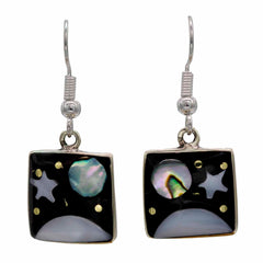 These small box ('caja') shaped earrings feature a cosmic space scene of stars, moons and planets crafted from mesmerising abalone shell. Our Mexican earrings are produced by hand in the picturesque town of Taxco using Alpaca metal alloy and silver plated hooks.