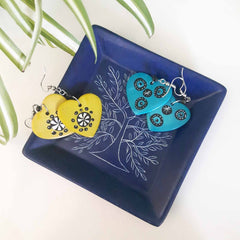 A selection of fabulously fun and brilliantly bold earrings! Each pair has a pattern hand painted on a carved Kenyan soapstone heart. Most of the worlds soapstone originates from Kisii in the western highlands of Kenya and so is home to the best soapstone artisans and carvers. Before starting work the stone must be immersed in water to make it softer and therefore easier to work with. Using a hammer and chisel the main shape is carved out and colour then added. Hypoallergenic hooks.