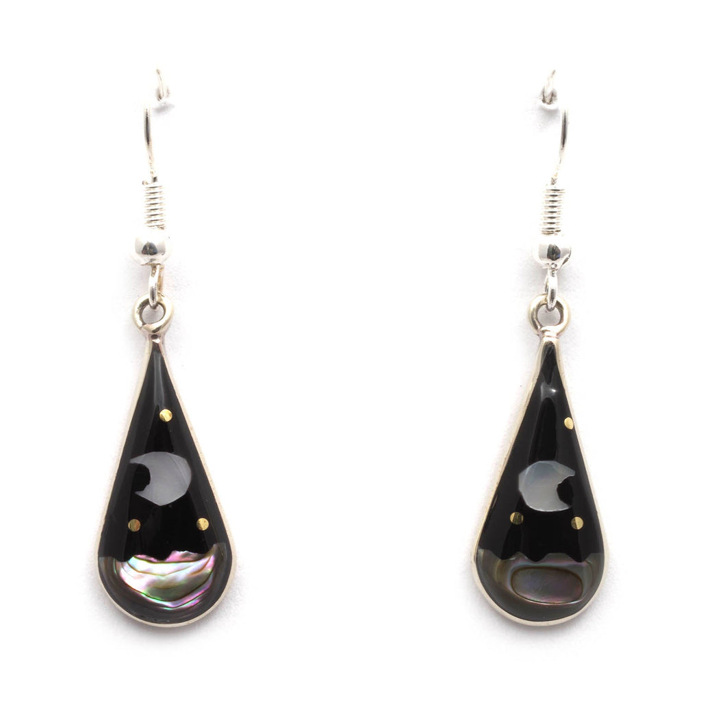 A set of celestial themed earrings hand crafted in Taxco, Mexico. Utilising a eye-catching tear drop design created using traditional Alpaca steel as the frame. Each earring has a starry night theme created using a combination of dyed and iridescent abalone shell. Silver plated fixings with Alpaca metal alloy earrings Approx 25mm Drop