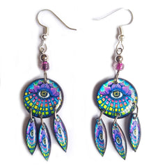 Colourful dangly earrings featuring a printed third eye design. Each pair is handmade in Peru and finished with silver plated hooks.