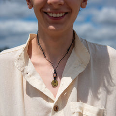 This necklace features two decorative dragon coins and a clay bead from Cusco, Peru, hand painted with an abstract mountain design. They have been threaded on a fully adjustable cord so it can be worn long or short.