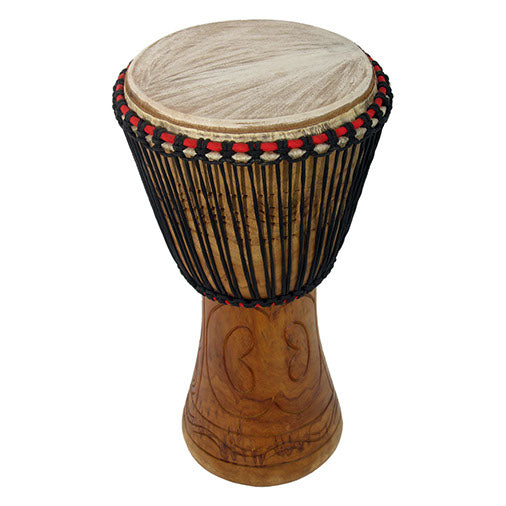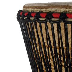 These beautiful Ghanaian djembes are hand carved from solid, chunky African cedar wood for fantastic deep bass tones and whip-crack highs. This 11" head version features a thick goat skin head and tough stringing. Our Ghanaian djembes also feature fascinating and authentic hand carved decorative patterns. These authentically African instruments are played with the bare hands and are capable of creating a large palette of percussive sounds, making it a versatile instruments in many genres of music. The drum body of these drums is made from the fast-growing wood of the Tweneboa tree, an African cedar and the wood is purchased from the forestry commission of Ghana. The drum skins are made from strong goat skin and have not been bleached or weakened by any other aesthetic process. Each drum has been individually hand made by African drummers who can create these beautiful instruments with the passion and specialist knowledge they have gained from years of experience.