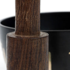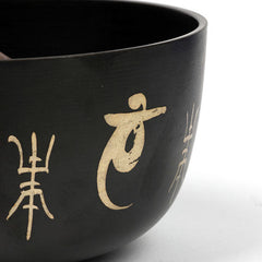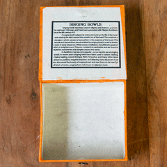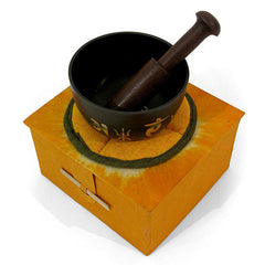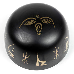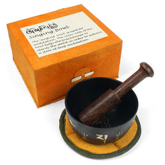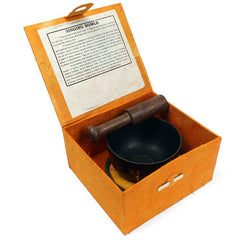Metal machine made singing bowl in black adorned with Buddhist symbols internally and externally showing the polished metal beneath. This gift set contains a medium sized singing bowl, wooden striker (puja stick) and cushion, beautifully presented in a Himalayan lokta paper box. It is a great priced little set ideal for those interested in aspects Tibetan Buddhism, meditation, energy healing or sound therapy. Machine made metal bowls are generally easier to play than traditional hand beaten bowls as they are have a smooth polished finish which allows for a steadier movement, this makes them ideal as a beginner bowl. Hand beaten bowls have more complex and overtone rich range of sounds but there is more of a knack to playing them than with machine made bowls. HOW TO PLAY: Rest the singing bowl in the palm of the hand; hold smaller bowls on the fingertips. Hold the striker in the middle with all fingertips pointing downwards. Gently tap the striker against the side of the bowl to ‘warm it up’. With an even pressure, rub the striker clockwise around the outside rim of the bowl. Use a full arm movement just like stirring a big pan of soup. Try to keep the striker straight and remember to apply pressure. Let the sound build up slowly as the singing bowl picks up the vibration.