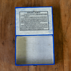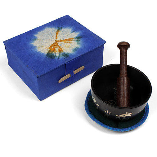 These machine made, black coloured singing bowls are beautifully adorned with Buddhist symbol relief work showing the original metal colour beneath. This little gift set contains a medium singing bowl, wooden striker (puja stick) and cushion, beautifully presented in a Himalayan lokta paper box. A great sounding bowl kit for those interested in aspects of Tibetan Buddhism, meditation, energy healing or sound therapy. Machine made bowls are generally easier to play than traditional hand beaten bowls as they have a smooth polished finish which allows for a steadier movement; this makes them ideal as a beginner bowl. Hand beaten bowls have a more complex and rich range of sounds but there is more of a knack to playing them than with machine made bowls. HOW TO PLAY: Rest the singing bowl in the palm of the hand; hold smaller bowls on the fingertips. Hold the striker in the middle with all fingertips pointing downwards. Gently tap the striker against the side of the bowl to ‘warm it up’. With an even pressure, rub the striker clockwise around the outside rim of the bowl. Use a full arm movement just like stirring a big pan of soup. Try to keep the striker straight and remember to apply pressure. Let the sound build up slowly as the singing bowl picks up the vibration.