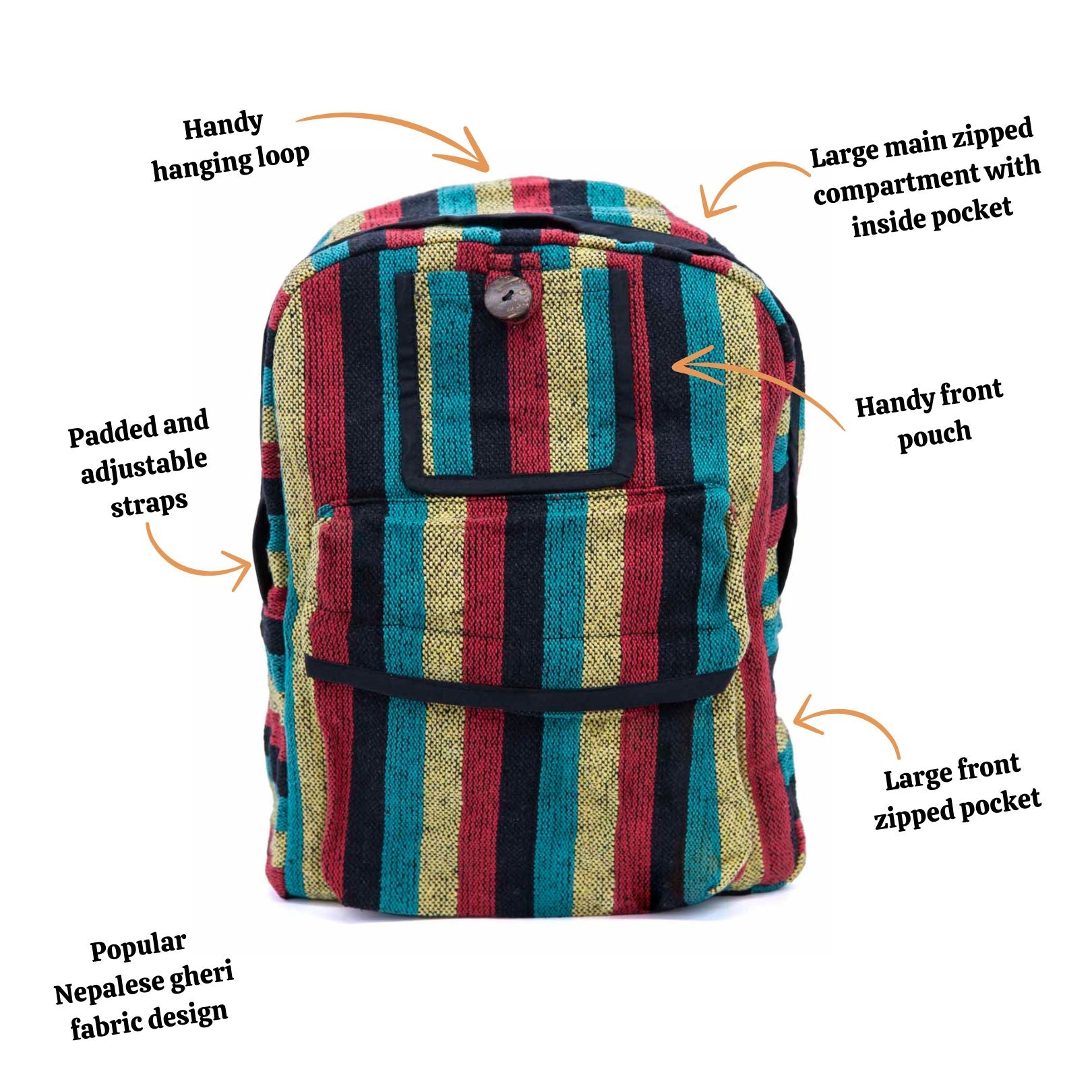 Who said practical had to be boring? These backpacks are made from vibrant gheri fabrics and include one main zipped compartment with inside pocket, a smaller zipped front pocket for easy access and adjustable shoulder straps.