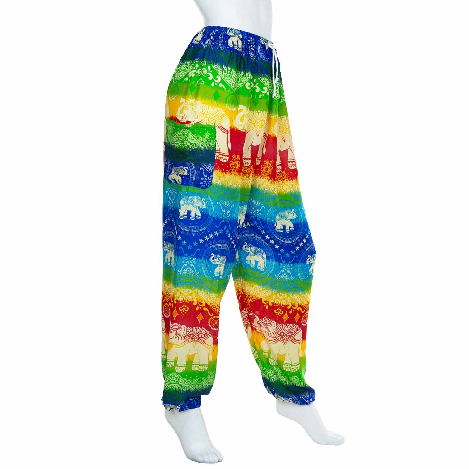 Combining our two favourites - rainbows and elephant print! An elasticated and drawstring waistband gives extra comfort to these vibrant trousers. They also have two handy two side pockets and elasticated ankles.