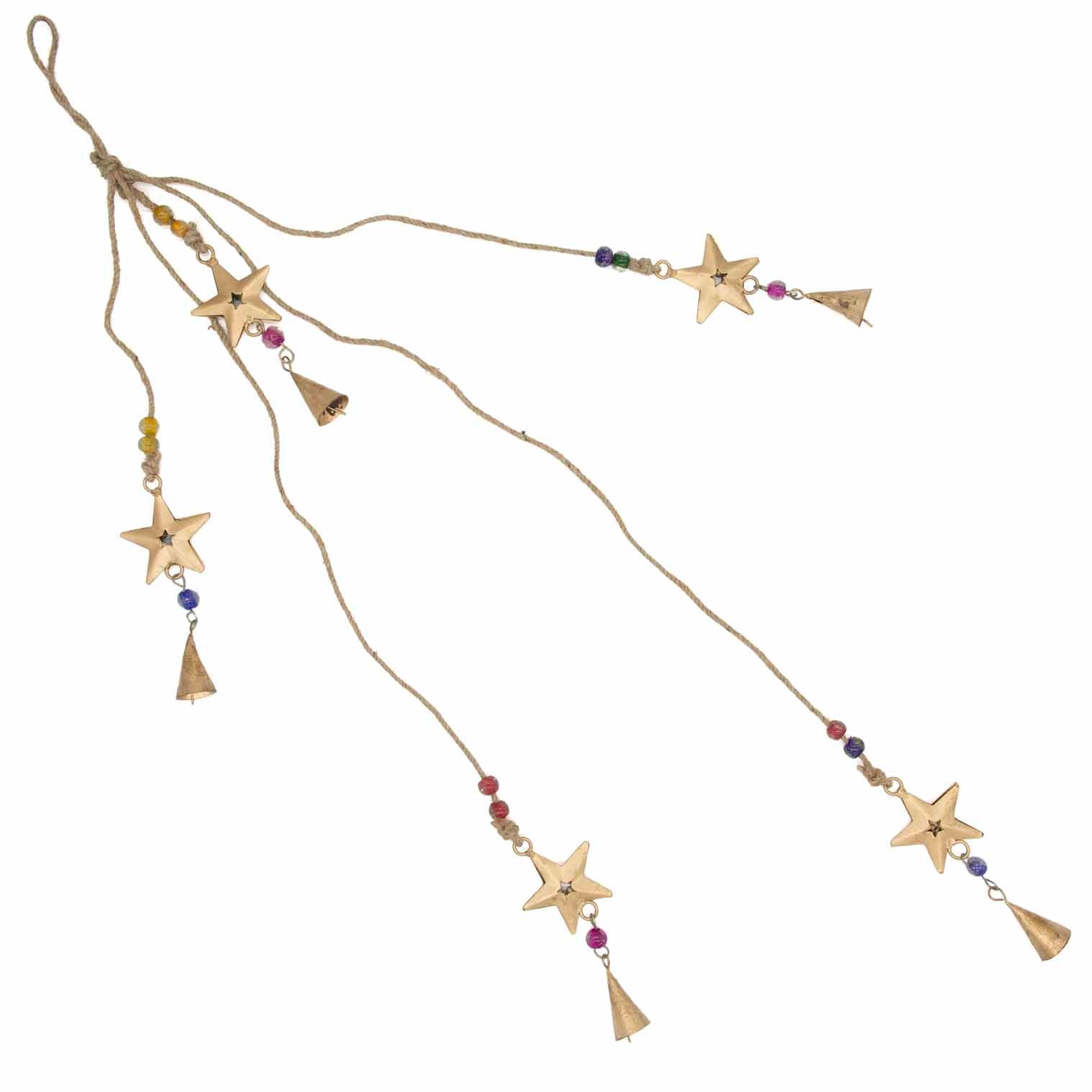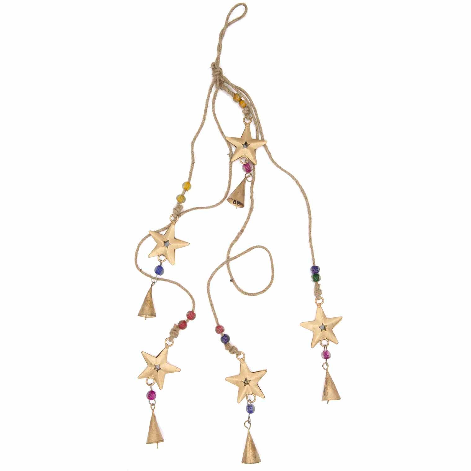 Bring a touch of celestial charm into your home with this handcrafted Star String of Bells. Featuring five ironwork stars, multi-coloured beads and tiny bells, this decorative string adds a whimsical touch to any room. Perfect for hanging across mantels, doorways, or windows, it infuses your space with a gentle jingle. And when the holiday season arrives, why not drape it over your Christmas tree for a unique and festive twist?