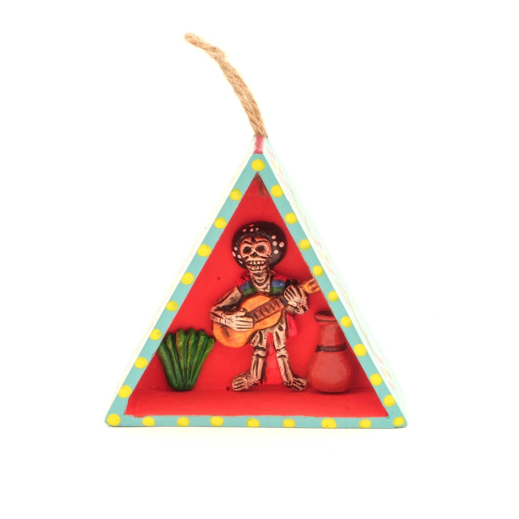Celebrate the joy of music and the playful spirit of the afterlife with this hand-painted retablo, featuring a skeleton guitarist lost in the rhythm of the moment. The scene radiates energy and charm, bringing a magical touch to any space, and makes a unique gift or seasonal decoration for Halloween and beyond.