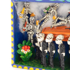 As masked skeleton pallbearers carry a coffin on their shoulders, jubilant spirits fly away above, a glass and a bottle in each hand. The piece shouldn't be seen as poking fun at the loss or sadness that the time brought, instead it continues in the tradition of the Day of The Dead festivities as a joyful remembrance of friends and family.