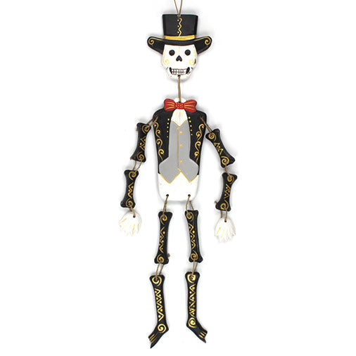 This charming Day of the Dead decoration brings a touch of festive spirit to your Halloween parties! Handcrafted from wood, this skeleton figure is adorned with vibrant candy skull-style patterns, capturing the essence of Día de los Muertos. Its lively design and dangly legs add a unique accent to your Halloween season.