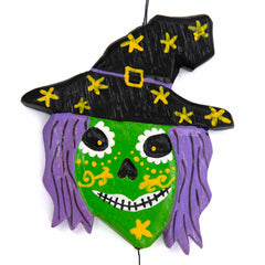This enchanting Halloween decoration features a playful trio of hand-painted characters, each decorated with colourful candy skull-inspired patterns. Together the withc, ghost and pumpkin create a fun and vibrant display, while the chimes below add a melodic tinkle, perfect for Halloween parties.