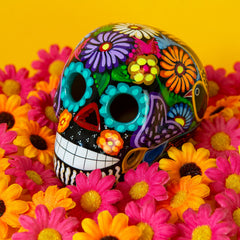 This vibrant Mexican Painted Skull is a charming tribute to Día de los Muertos, the Day of the Dead. Handcrafted from ceramic, each skull is adorned with vivid candy skull-style patterns and finished with a glossy glaze, capturing the festive spirit of this Mexican tradition. Its size makes it a versatile decoration, perfect for adding a touch of colour and cultural flair to your space, especially during the Halloween season.