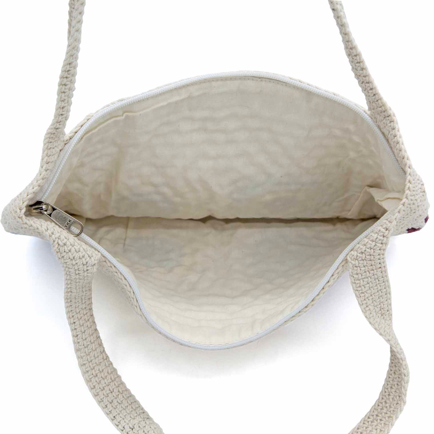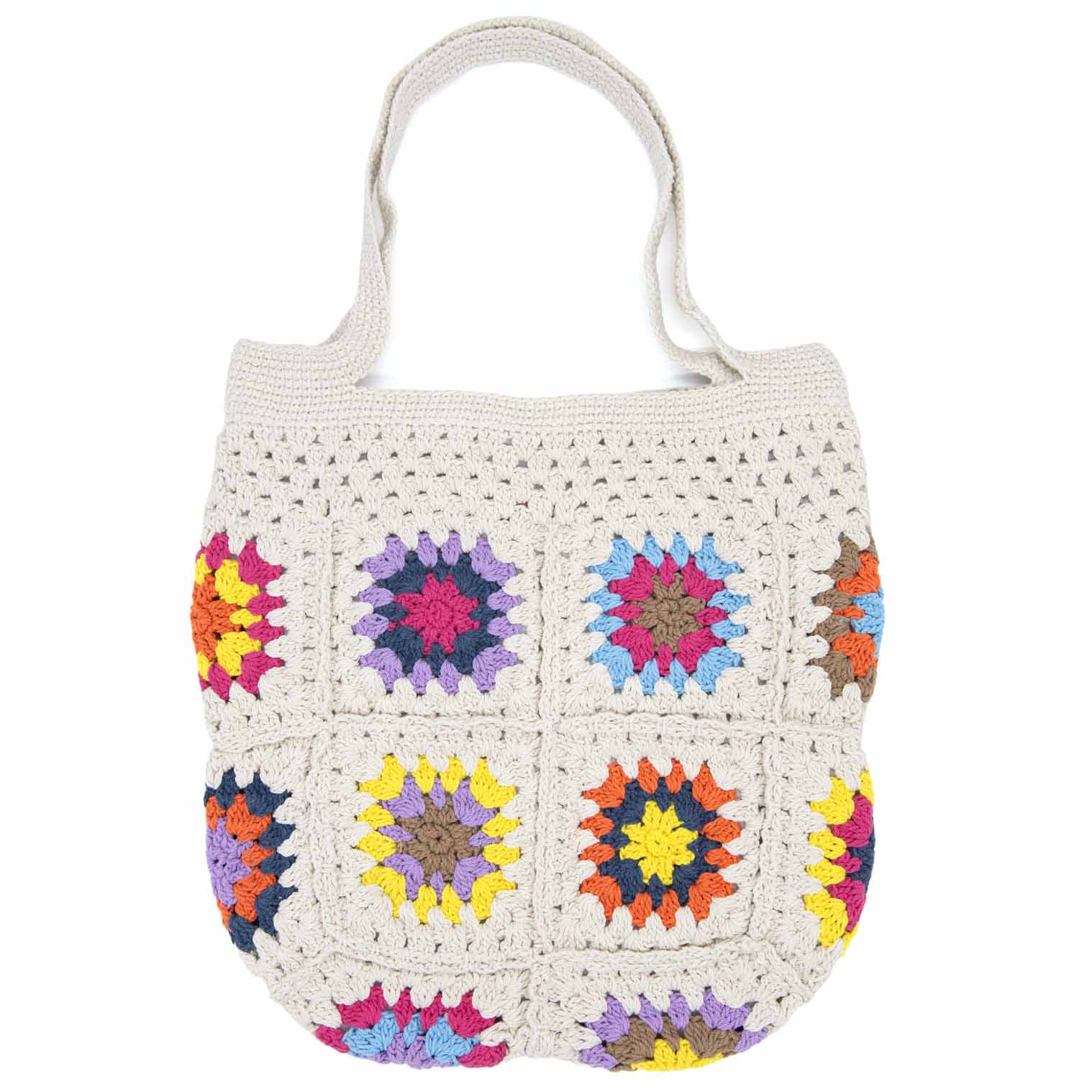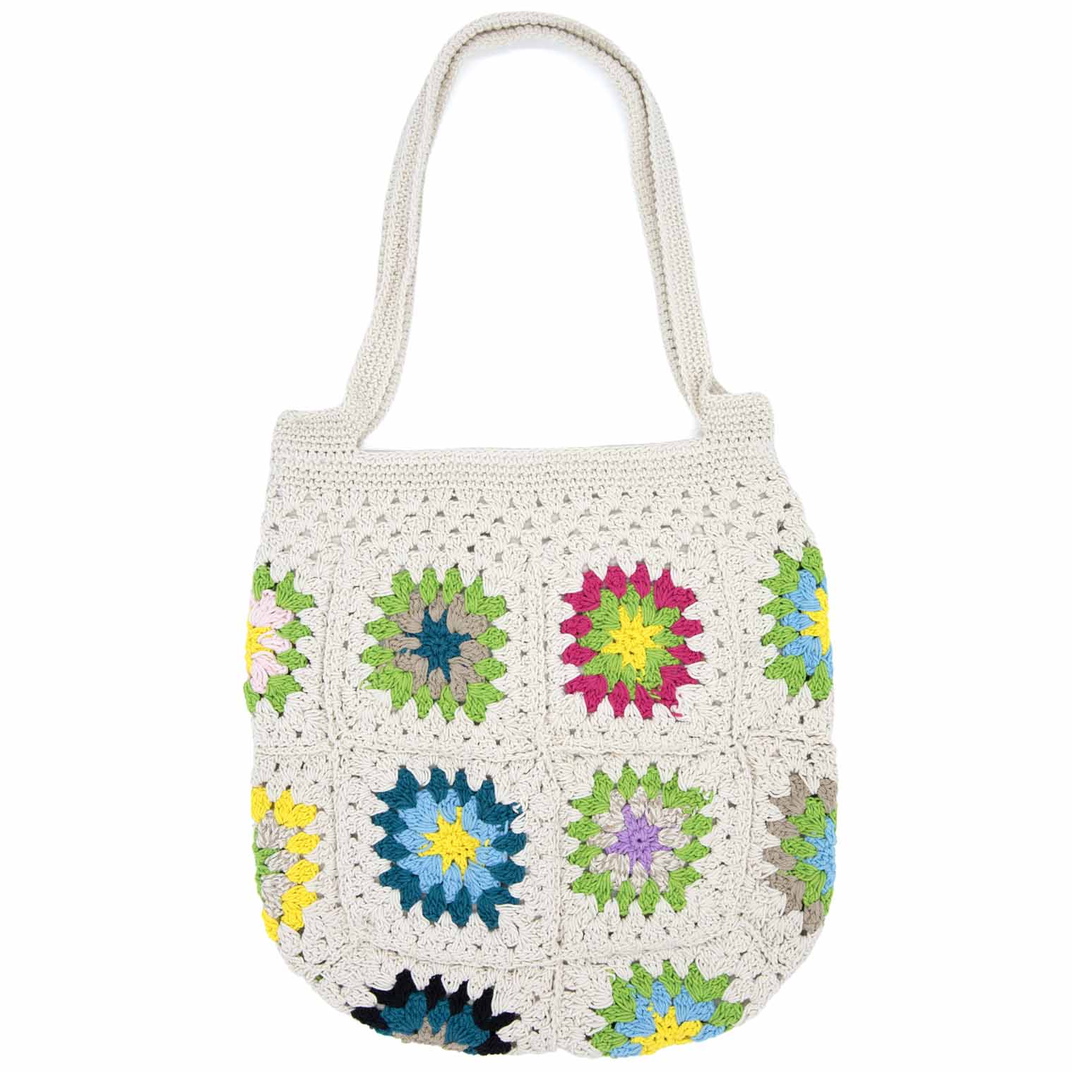 This gorgeous granny square shoulder bag is handmade in Bali, Indonesia and comes in in a lovely off-white colour with colourful flower motifs. They have a white lining inside and zip closing for security when out and about! These purses are made high quality macrame style cotton.