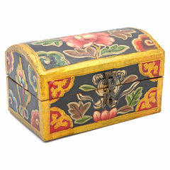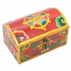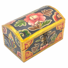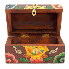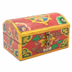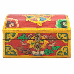This Tibetan style wooden box is a versatile storage piece finished with colourful hand painted designs. The sturdy construction and hinged lid make it ideal for storing small treasures, jewellery or incense. Its compact size makes it easy to place on a shelf or altar.