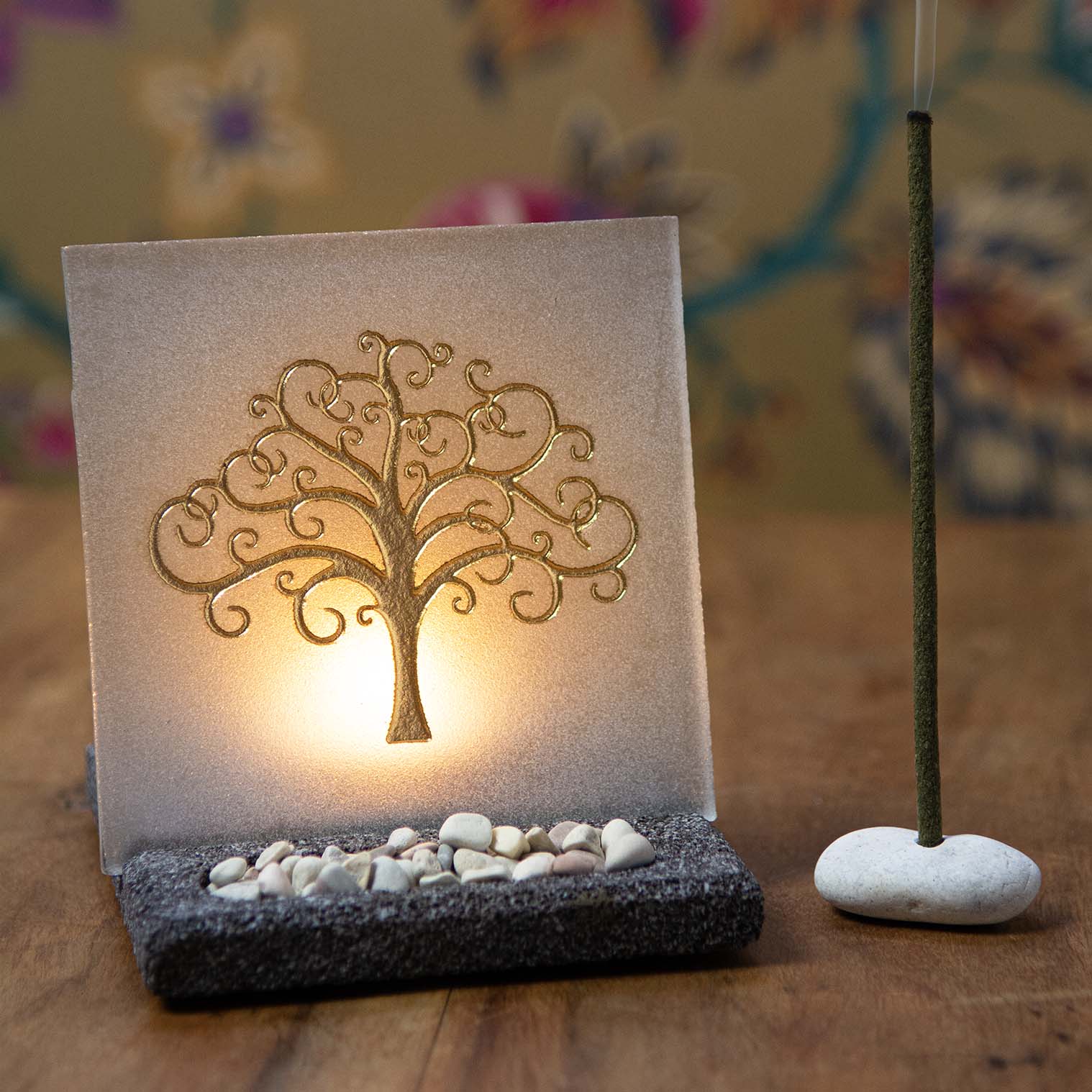 Elegant flower of life tealight and incense holder with frosted glass screen decorated with a gold symbol, simple gravel display and sturdy heavy resin base. This neat little gift set can help to create a wonderful tranquil mood. When a candle is lit, the light projects through the frosted glass plate to create delicate patterns on the wall. Presented in a gift box displaying the symbol, it contains the frosted glass plate, the resin base, a small pack of gravel and a simple 'pebble' stick incense holder. The base has a large foam pad to prevent scratching polished surfaces and further smaller pads to help secure the glass plate into the base. Tealights and stick incense are not included.