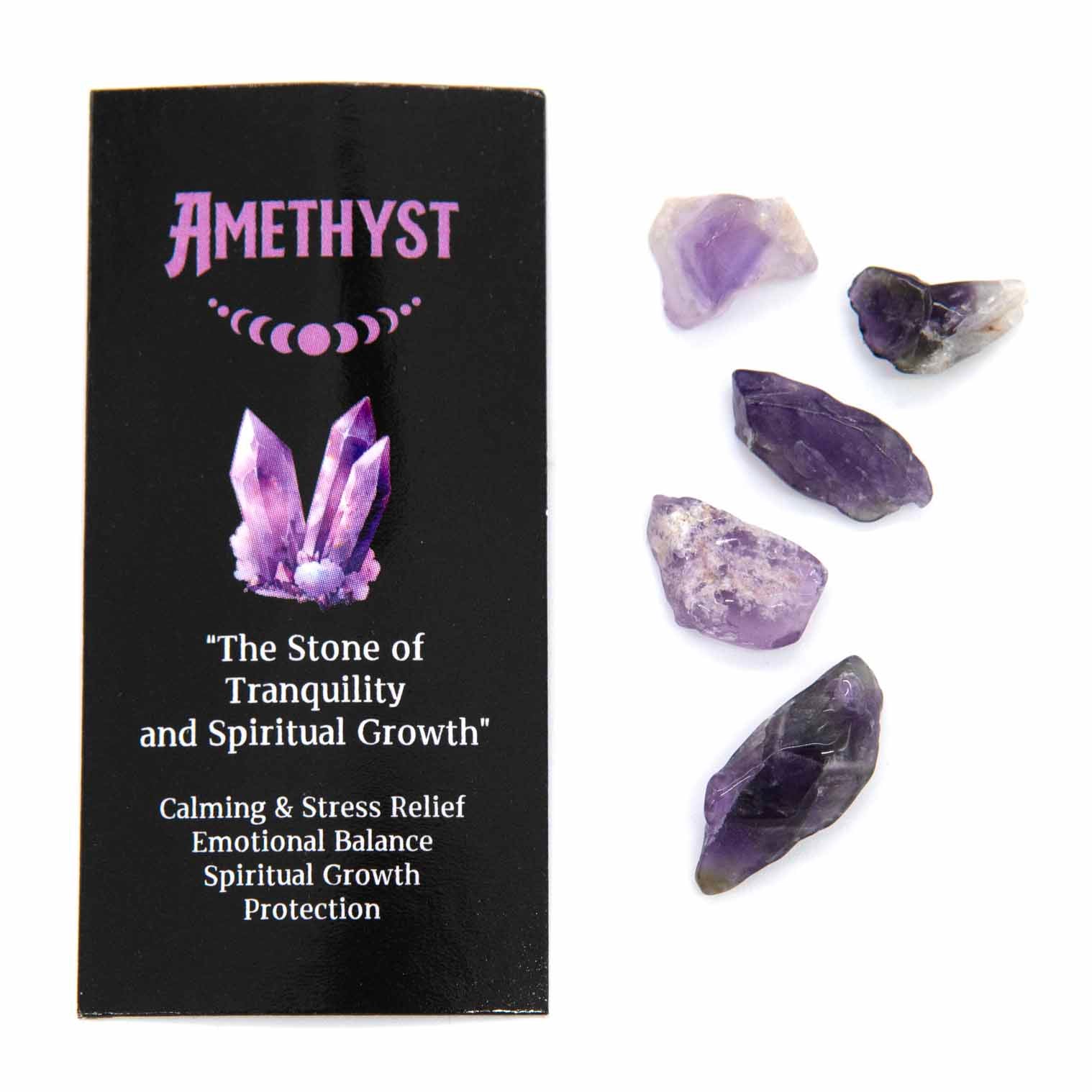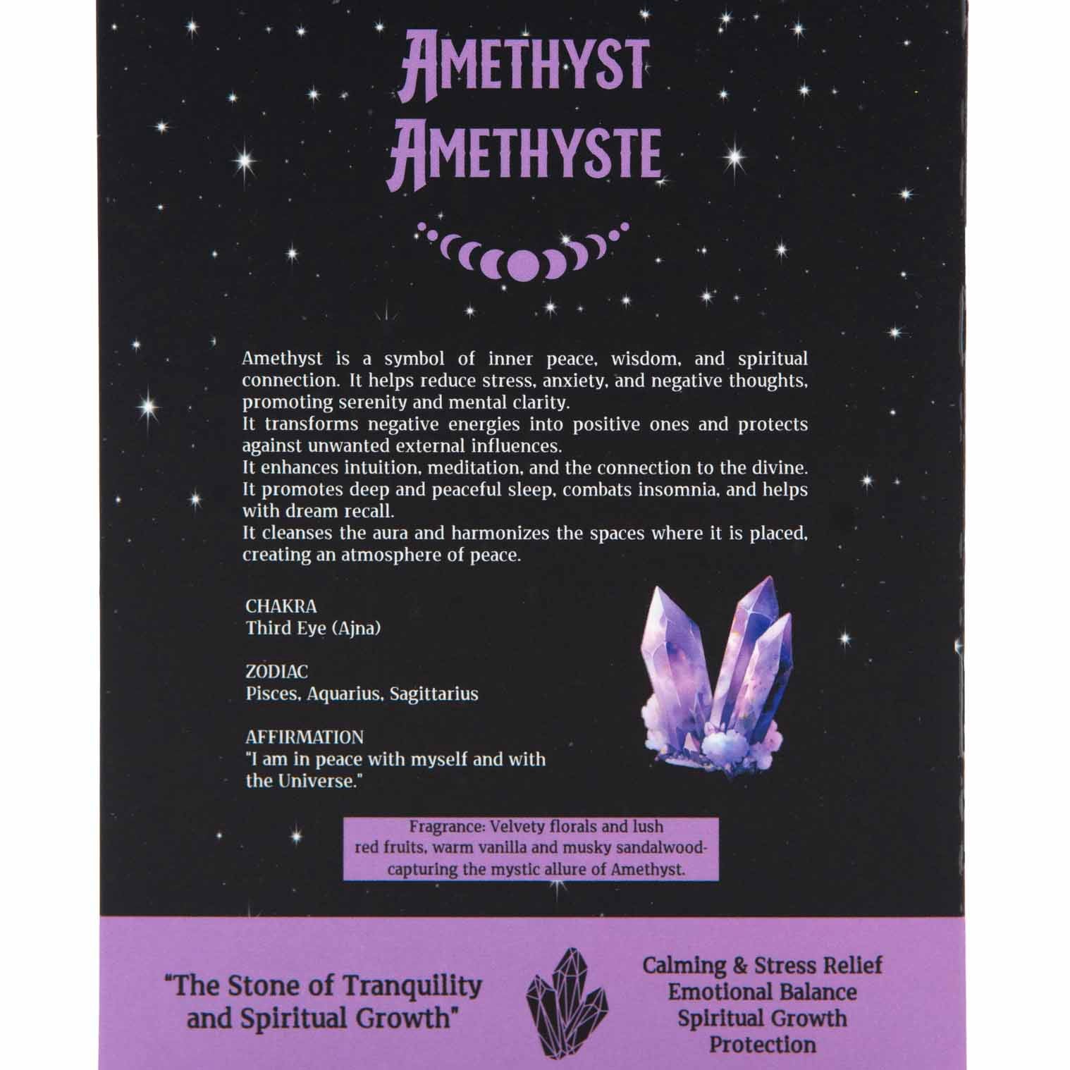 From Hari Darshan's Crystal Magic range, this Amethyst incense includes an information card about the crystal and a small set of mini amethyst crystals. Amethyst is believed to promote spiritual awareness and intuition, provide calming and protective energy, and support restful sleep while helping to relieve stress and anxiety.