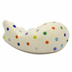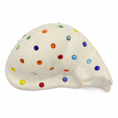 This pretty kitty has been handcarved from soapstone by skilled artisans in Kenya. It has been left in it's natural, undyed colour but inlaid with tiny colourful beads, giving it an extra tactile feel.